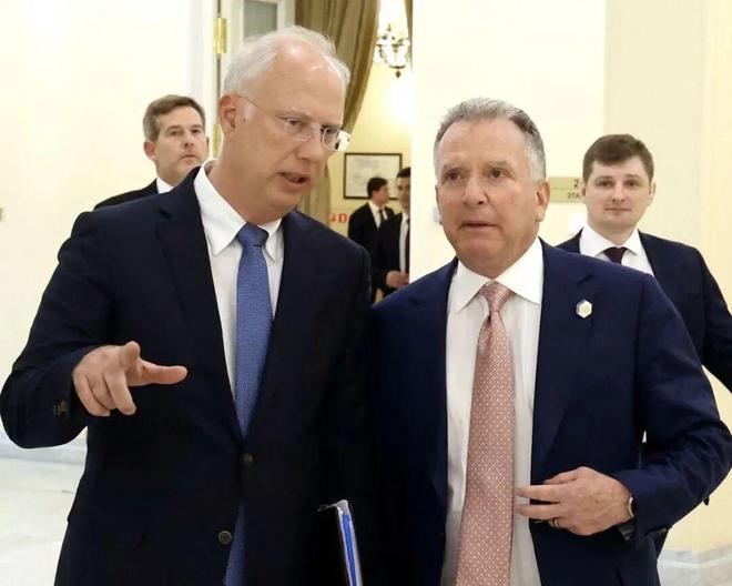 俄罗斯特使德米特里耶夫(左)与美国特使威特科夫(右)合影,有说法称,两人作为两国代表谈判制定了“28条”